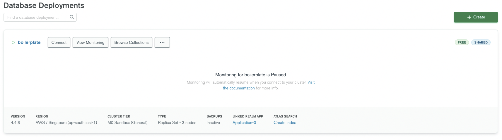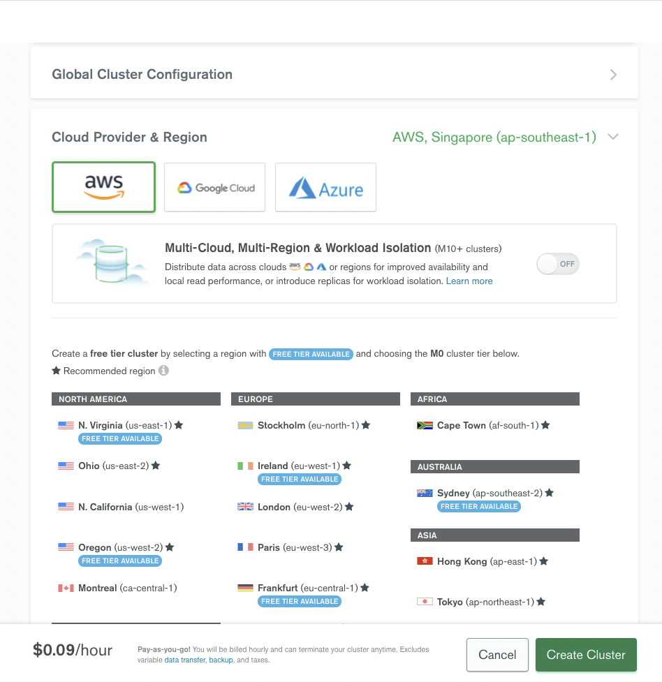 그리고 나면 서버 옵션을 선택할 수 있는데 제일 많이 사용하는 aws와 무료로 사용할 수 있는 singapore 지역을 선택해주고 M0 Sandbox를 선택해주면 무료로 사용할 수 있습니다.